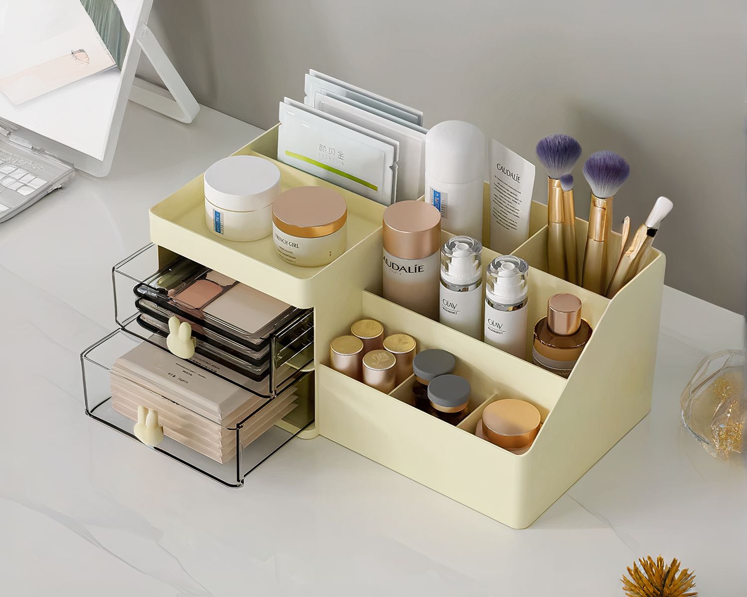 Ne laissez plus le désordre gâcher votre espace de beauté. Ajoutez une touche de sophistication et d’ordre à votre routine quotidienne avec notre boîte de rangement maquillage à grande capacité. Choisissez votre couleur préférée : jaune pastel, rose poudré ou blanc épuré. Transformez dès aujourd'hui votre espace beauté en un cocon de style.