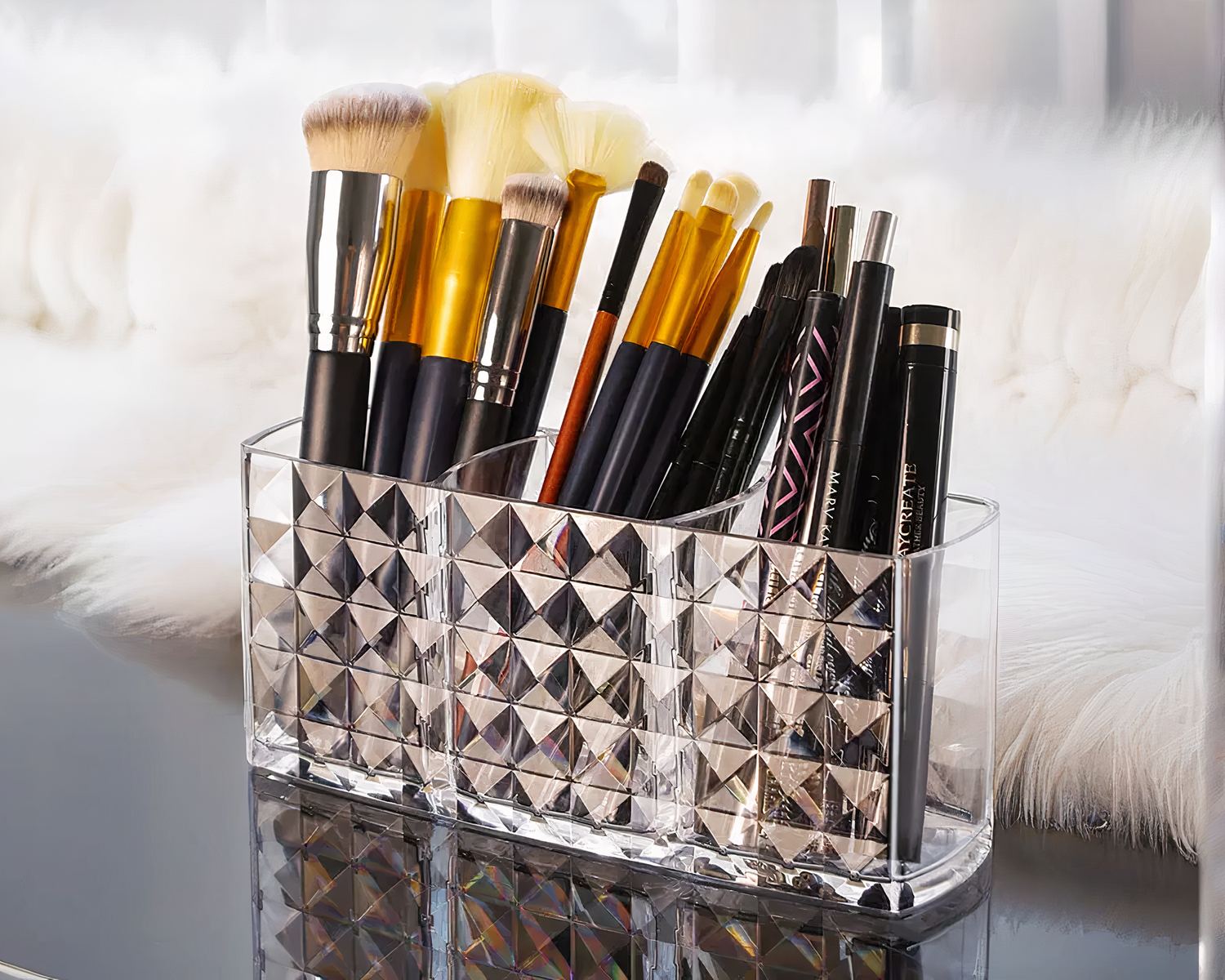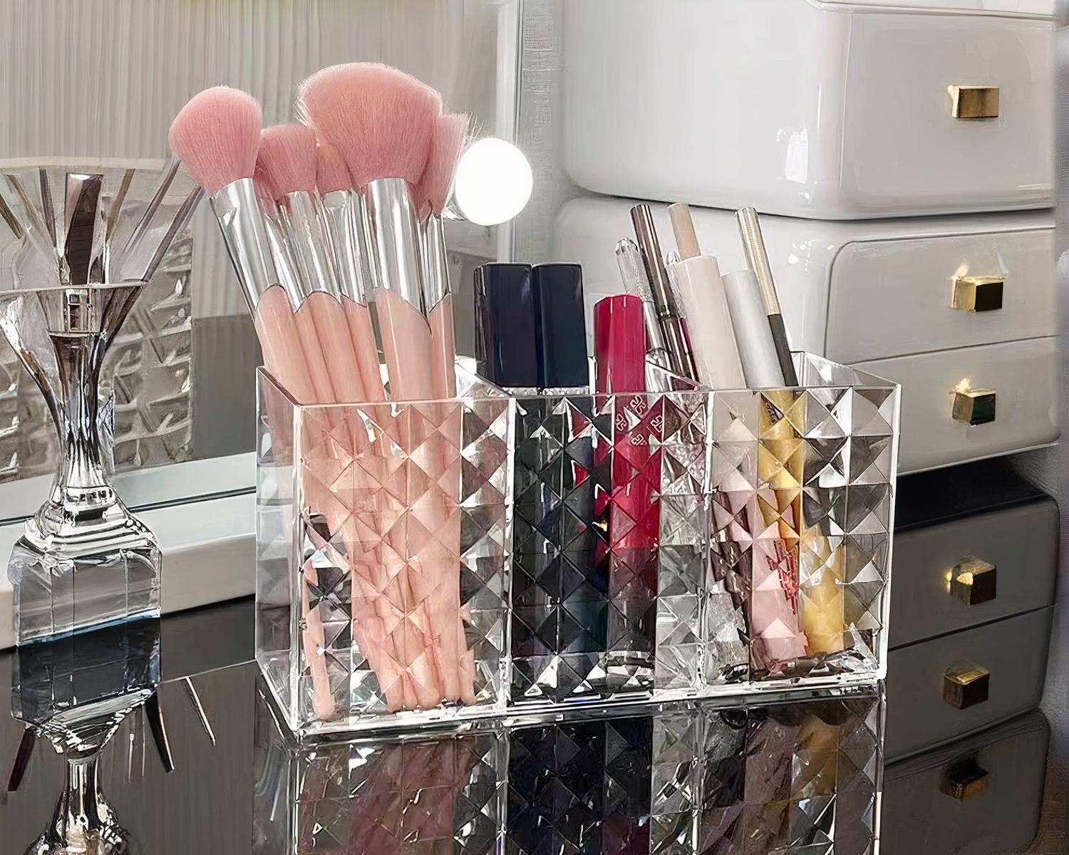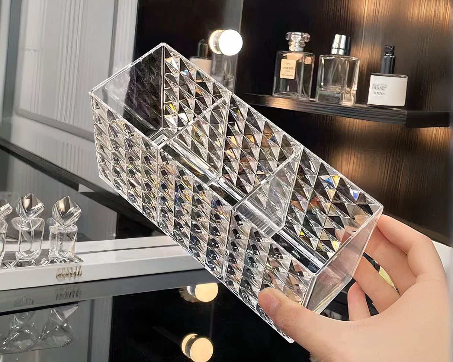 Idéale pour une utilisation dans la salle de bain, sur une coiffeuse ou dans une chambre, notre boîte de rangement est aussi belle que fonctionnelle. Utilisez-la pour organiser vos rouges à lèvres, pinceaux, mascaras, crayons, et autres accessoires de maquillage. Vous pourrez également détourner notre boite pour la mettre sur votre bureau et y ranger vos stylos !