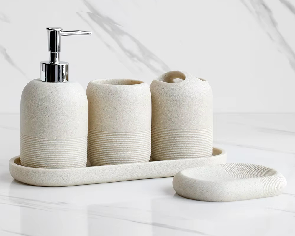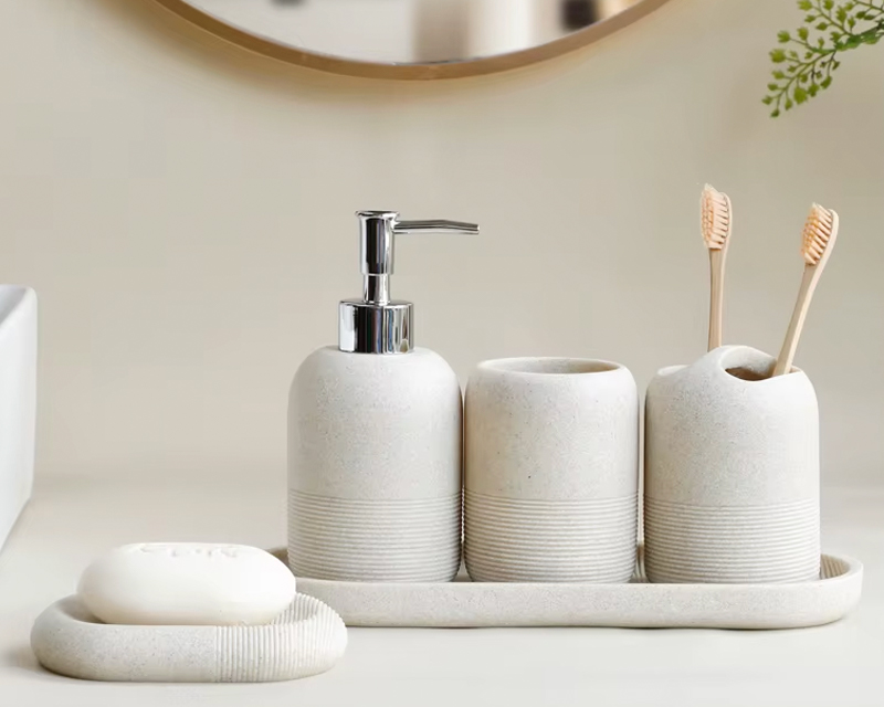 Fabriqué en résine de haute qualité, cet ensemble d'accessoires de salle de bain est constitué d'éléments essentiels qui se doivent d'être dans votre salle d'eau pour un espace pratique, fonctionnel et esthétique. Disponible en deux coloris, beige et gris, ce set s'adaptera parfaitement à votre déco, quel que soit sont style.