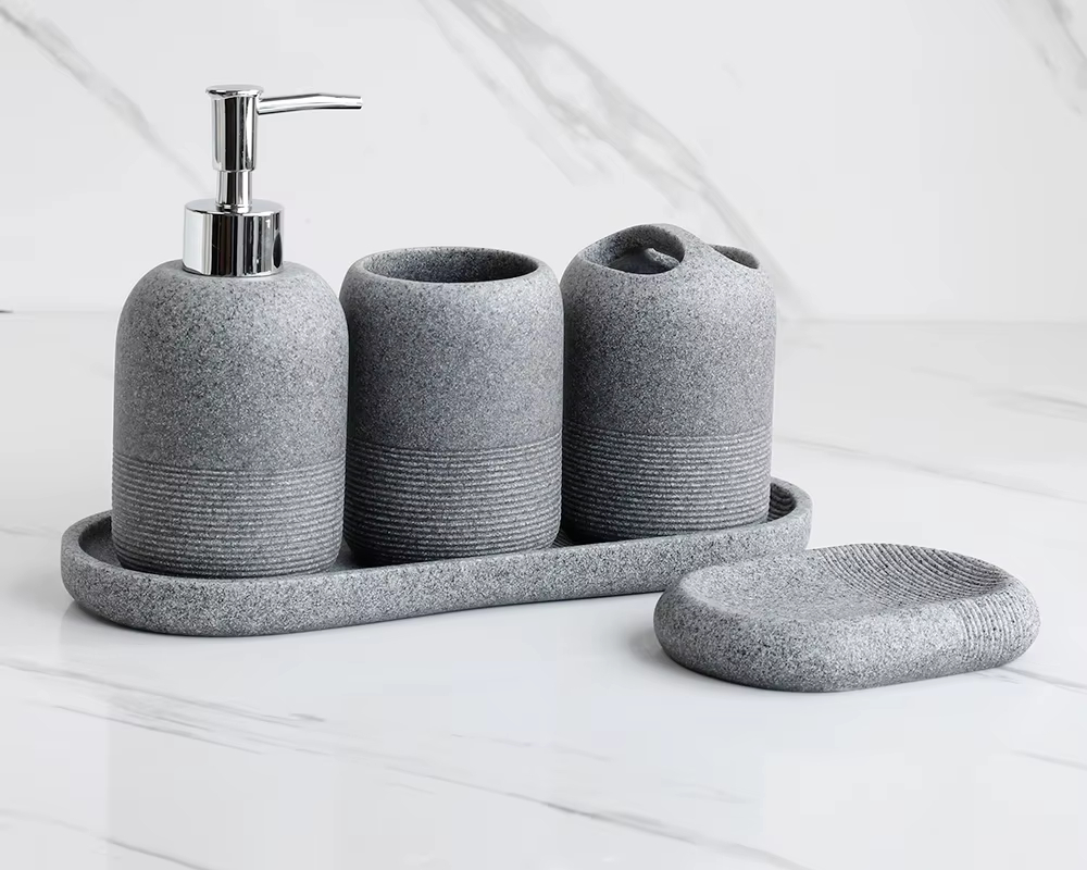 Cet ensemble d'accessoires de salle de bain comprend un distributeur de savon liquide, un gobelet, un porte-brosse à dents, un porte savon et un plateau pour y disposer les différents éléments de façon élégante. Chaque pièce de cet ensemble est conçue avec une attention particulière aux détails, offrant à votre salle de bain une touche de sophistication et de style.