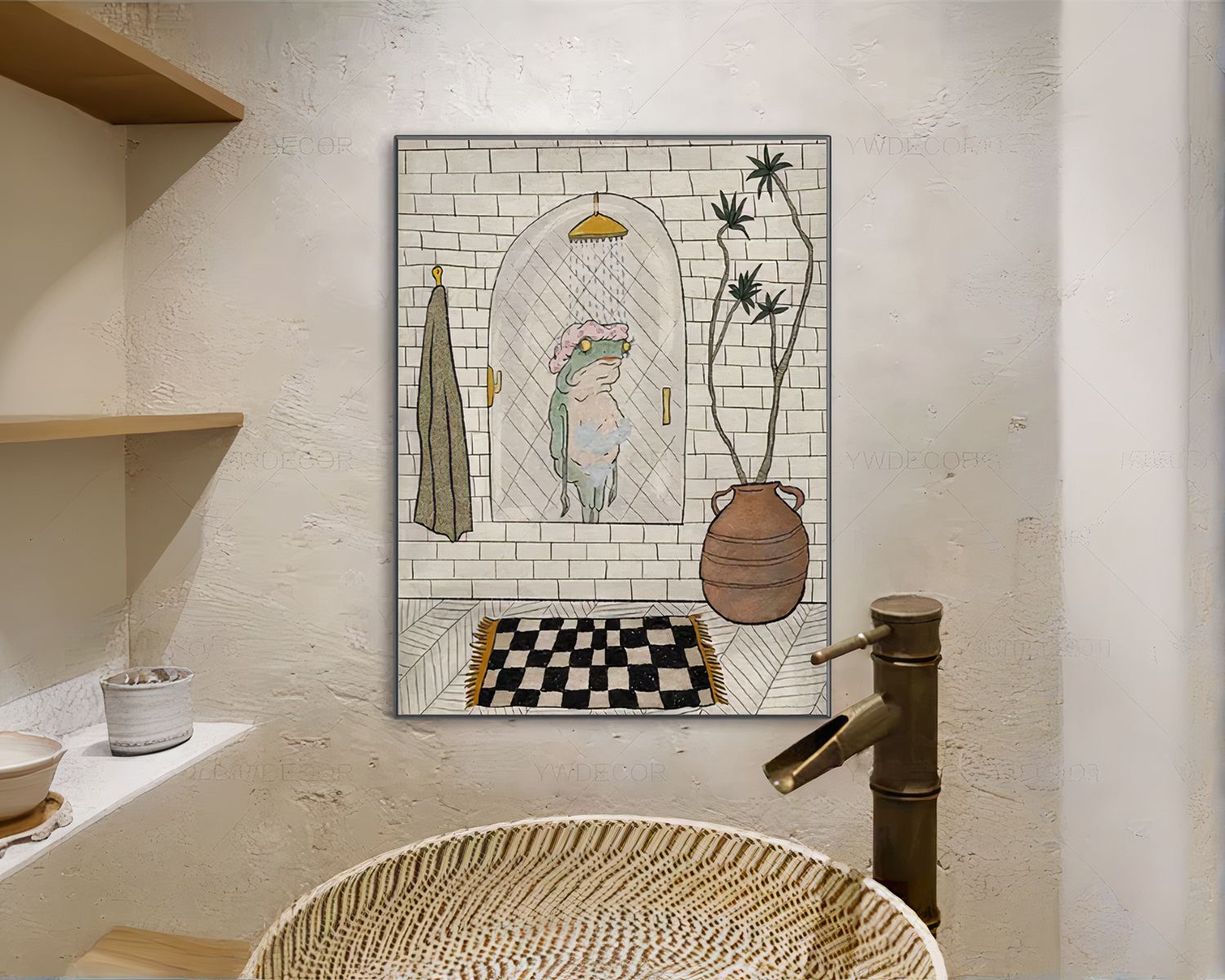 Ce tableau avec une grenouille sous la douche est idéal pour apporter une touche d'originalité et de fantaisie à votre décoration intérieure. Il trouvera parfaitement sa place dans une salle de bain, une chambre d'enfant ou même un salon, ajoutant une note ludique et décalée à votre espace de vie.