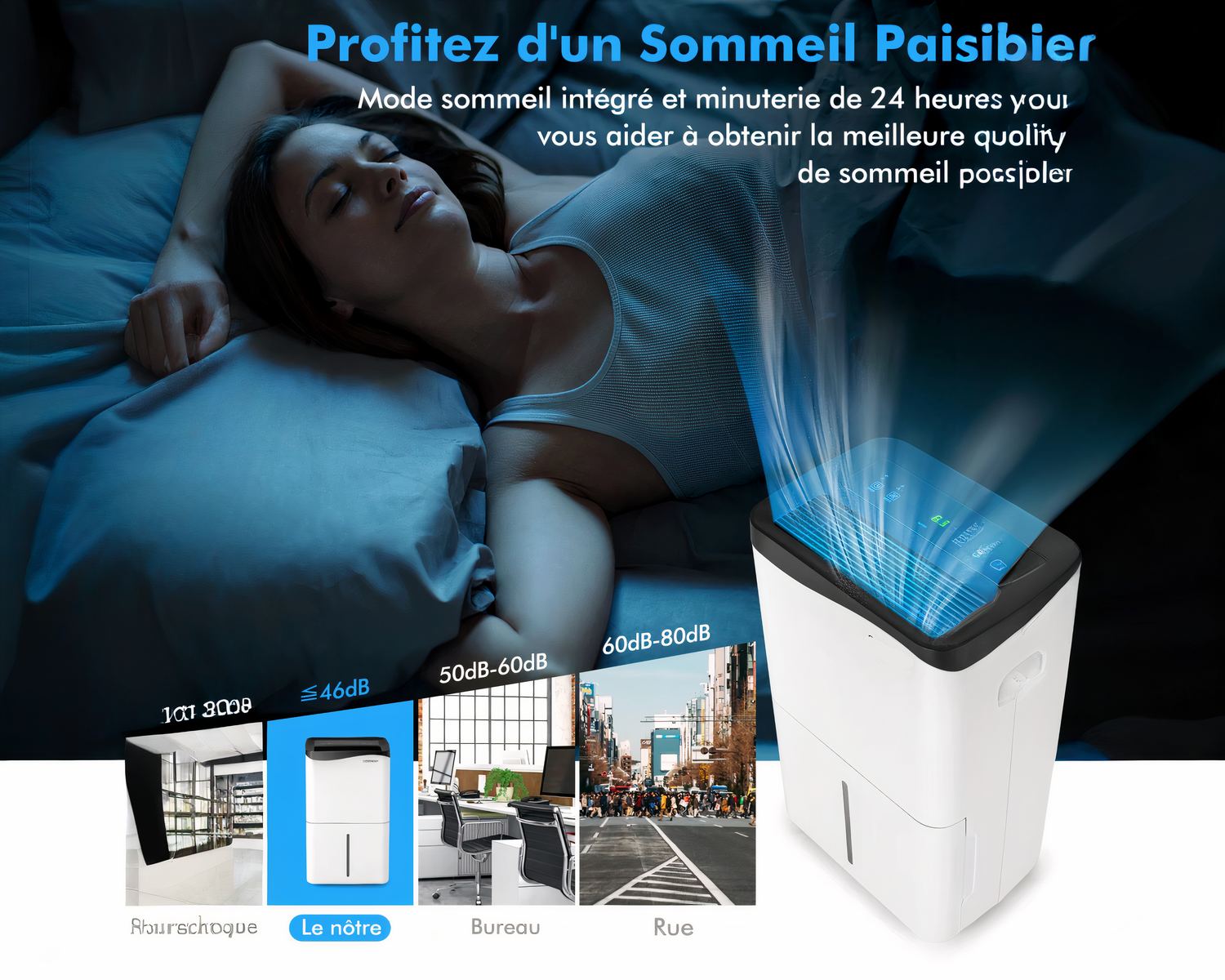 L'écran tactile lisible de notre déshumidificateur vous permet de piloter le mode et la vitesse, régler la minuterie, le taux d'humidité suivant l'un des quatre modes proposés : déshumidification automatique, séchage continu, veille et ventilateur. Facile à utiliser et pouvant être relié à votre téléphone, vous pilotez aussi à distance. Efficace et silencieux, 46 db, il crée un environnement confortable pour dormir ou travailler.