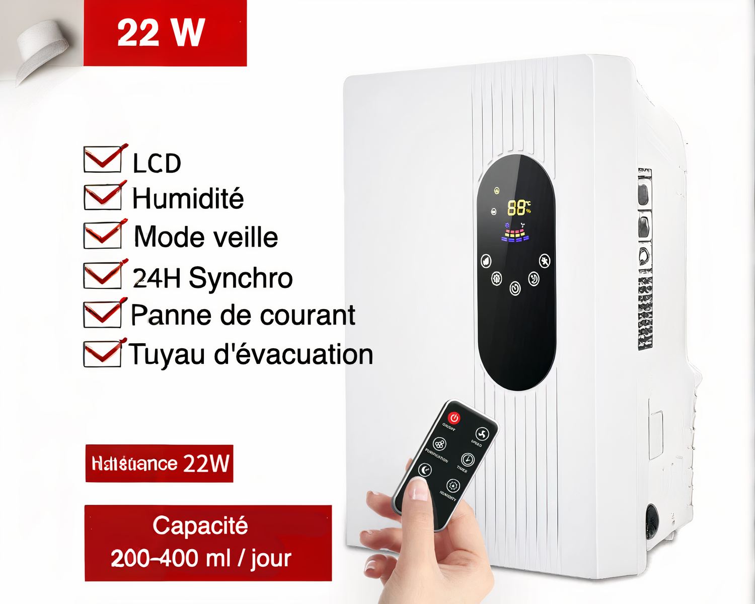 Avec l'aide de la télécommande ou directement sur l'écran, vous pouvez programmer le mode nuit, la durée et la force d'aspiration. Notre déshumidificateur agit pour votre santé contre les désagréments causés par l'humidité comme les problèmes respiratoires, les allergies, ou les moisissures sur les murs. Nous le proposons en trois puissances de 22, 42 et 72 watts, selon votre cas et la surface à traiter.