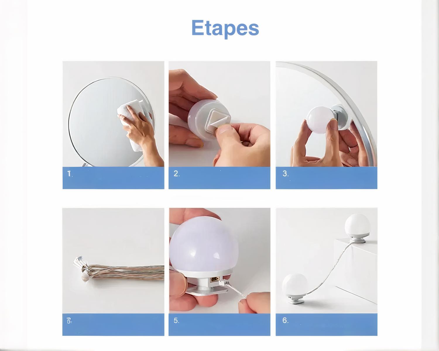 Le kit possède un commutateur-variateur qui vous aidera à réguler la luminosité et la couleur voulue : pour le maquillage de tous les jours par exemple, optez pour le blanc et pour un maquillage de soirée, préférez le blanc chaud. Si vous le désirez, les trois couleurs peuvent également alterner en continu. Les ampoules délivrent une lumière douce, sans éblouissement et donc confortable pour les yeux.