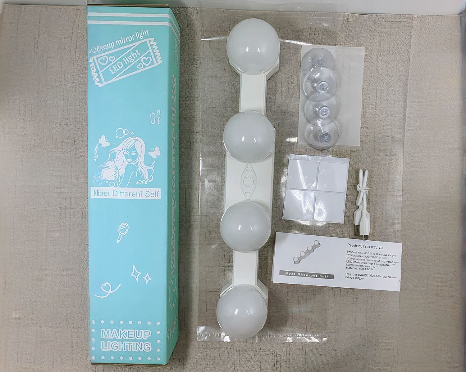 Ce module de quatre ampoules est un produit qui se charge sur port USB et permet jusqu'à 5 heures de pleine luminosité : un voyant de charge vous indiquera s'il est chargé en passant du rouge au bleu. Il se positionne sur le support de votre choix, par exemple un miroir ou un mur, à l'aide de ventouses et de ce fait convient parfaitement aux salles de bain et salles d'eau.
