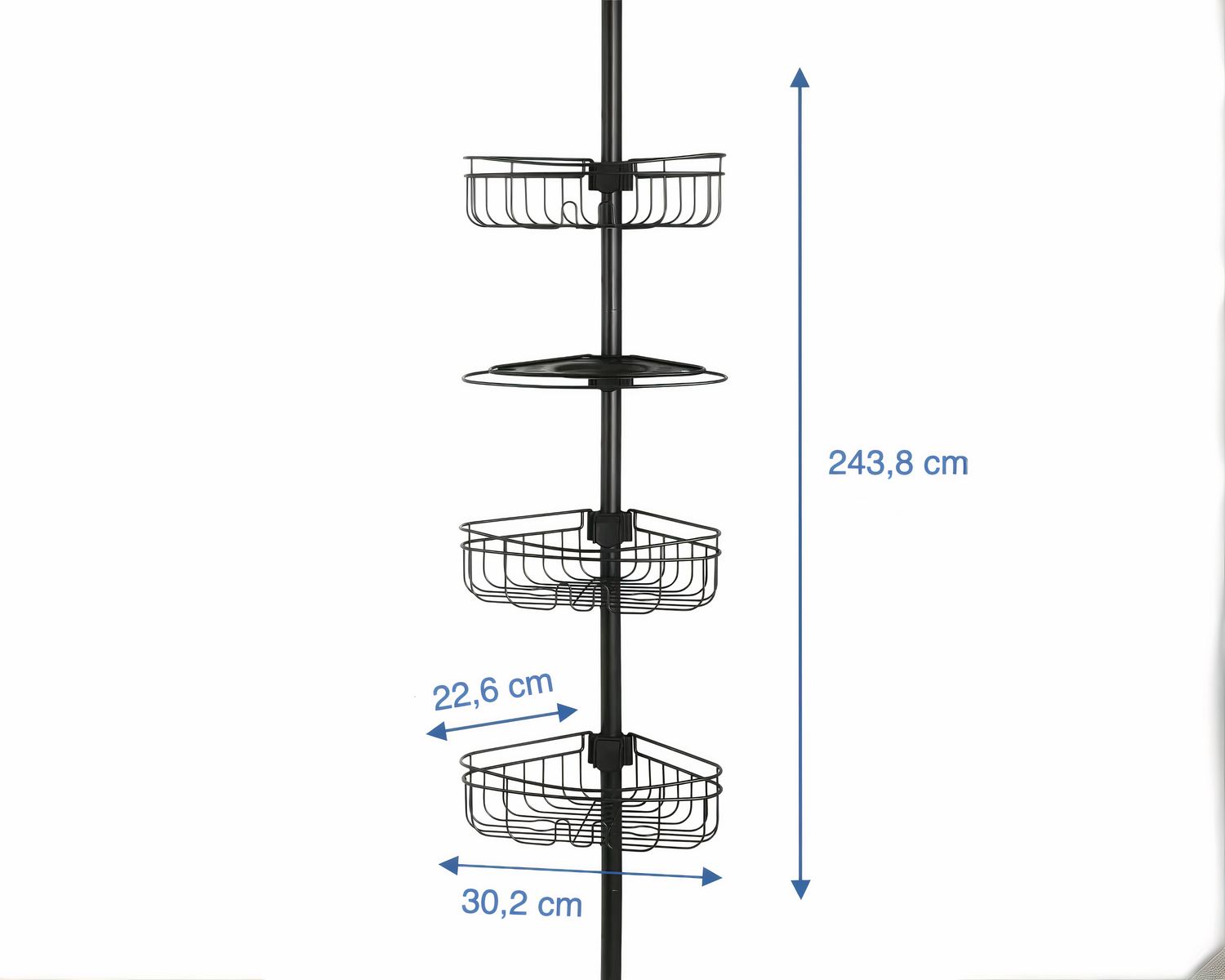 Cette étagère, ou plutôt ces étagères d'angle, sont fixées sur une colonne robuste en acier inoxydable noir avec un levier anti-dérapant qui verrouille solidement chaque niveau à la hauteur définie par vous. La colonne est ajustable en hauteur, allant de 125 cm à 310 cm, ce qui lui permet de s'adapter parfaitement à la distance entre le bas de votre douche et le plafond. Grâce aux instructions claires fournies dans le paquet, l'installation est rapide et ne nécessite aucun outil. Idéale pour les douches modernes ou traditionnelles.