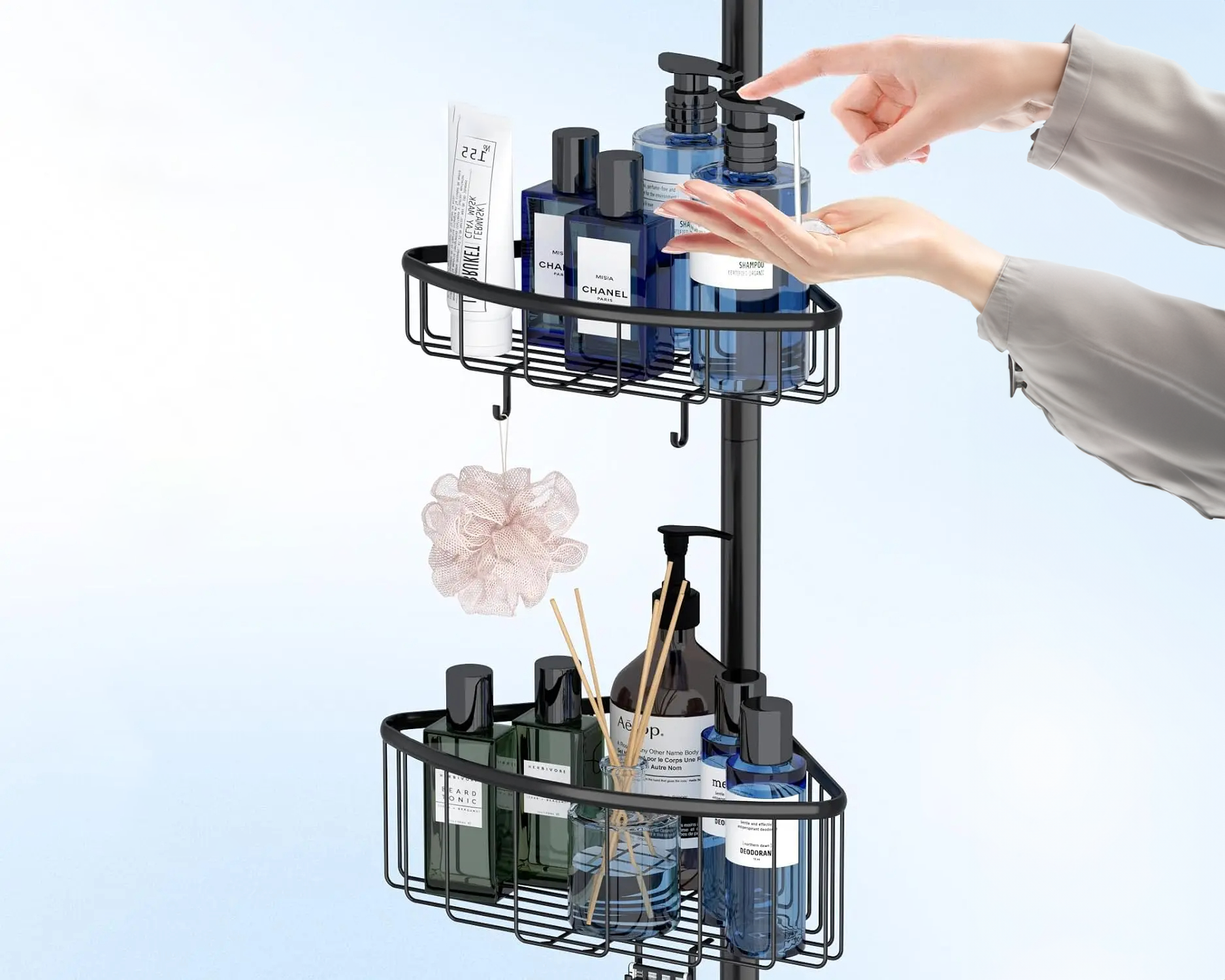 Chaque étagère peut supporter une charge maximale de 3,5 kg, assurant un rangement stable et fiable pour vos articles essentiels. Les crochets intégrés sur les paniers permettent de suspendre des accessoires comme des éponges ou des rasoirs.