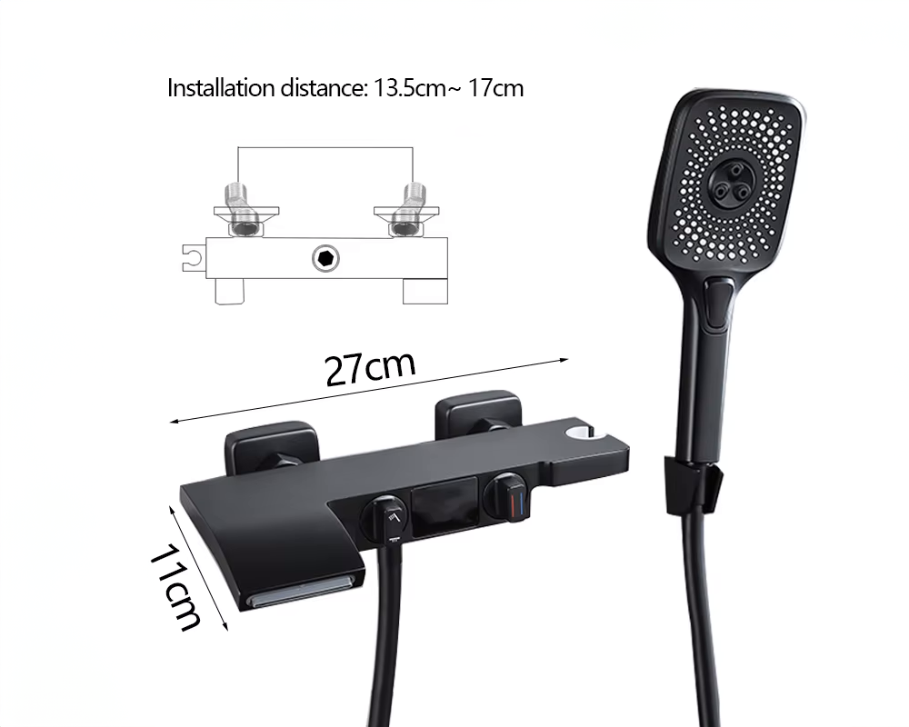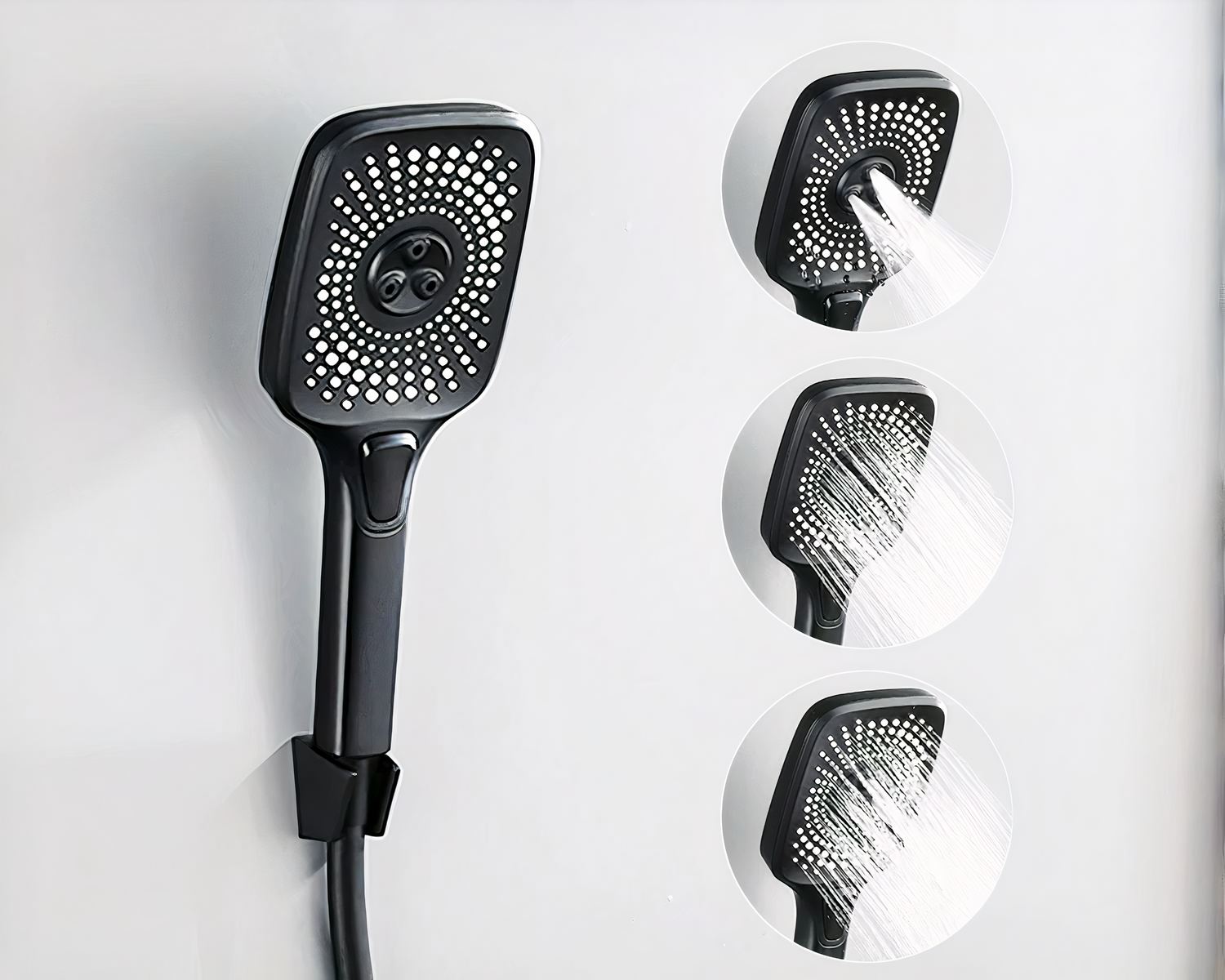 Notre mitigeur à affichage numérique est doté d'un look moderne, épuré et compact : il combine sur moins de trente centimètres un bec à grand débit, un affichage couleur et un crochet pour pommeau de douche, sans oublier le commutateur pour bain ou douche. Le pommeau de forme rectangulaire est conçu pour délivrer trois types de jets différents, à partir du bouton sur le manche, à vous de choisir.