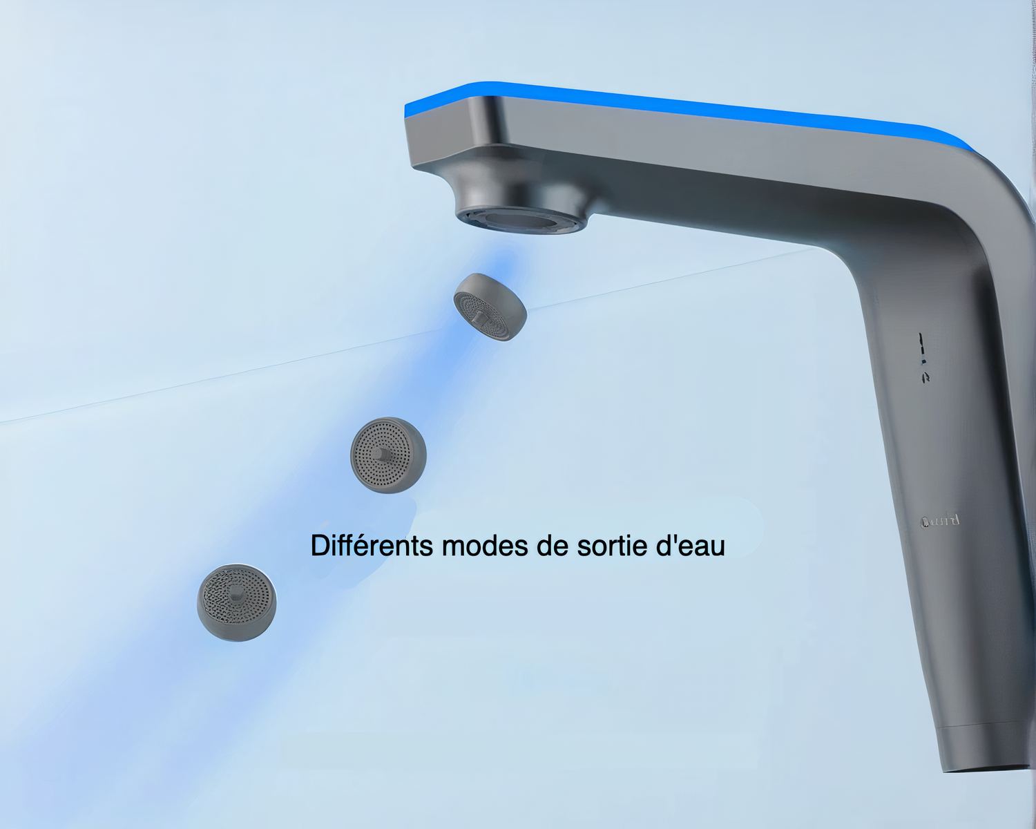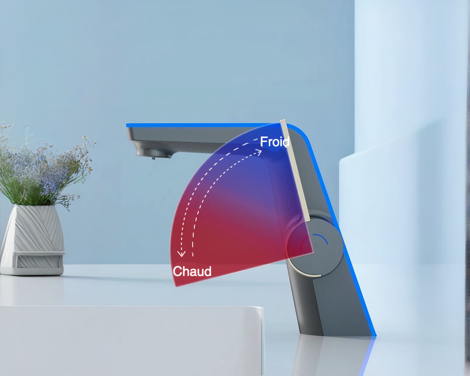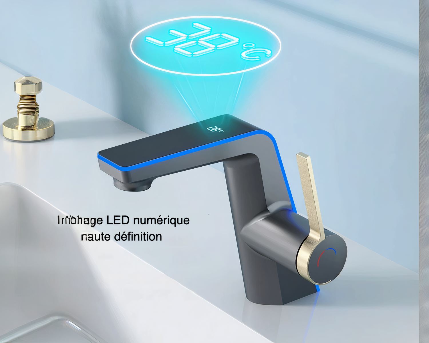 Notre mitigeur pour lavabo de salle de bain est doté d'un robinet moderne à affichage LED : il donne la température de l'eau en degrés au dessus et en couleurs sur le bord extérieur. Du bleu profond au rouge vif en passant par le vert, il est ludique et renseigne d'un seul coup d'oeil : cela peut s'avérer éducatif, utile et même sécurisant pour de jeunes enfants.