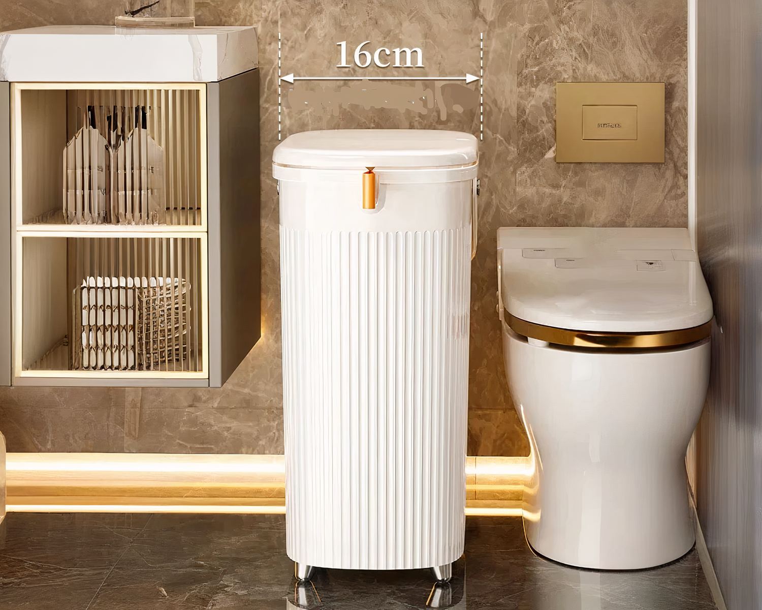Cette jolie poubelle de salle de bain est dotée d'un design élégant et d'une grande poignée pratique pour la déplacer où bon vous semble et qui apporte un brin d'originalité. Elle est totalement étanche, un bon point pour la poser dans la salle d'eau ou de douche. Le matériau qui la compose est très solide et durable et son couvercle est hermétique, un bon point de plus.