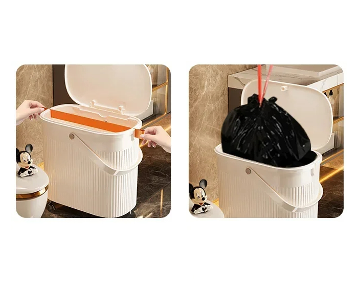 Le couvercle se soulève grâce à un clic, petit bouton pour ouvrir et fermer, et apparaît une longueur de 25 cm. Et surtout une encoche de chaque côté où vous viendrez glisser les attaches de votre sac poubelle pour facilement le positionner et l'enlever simplement ensuite. Ce design aux détails pratiques ultra réfléchis Permet une utilisation optimale.