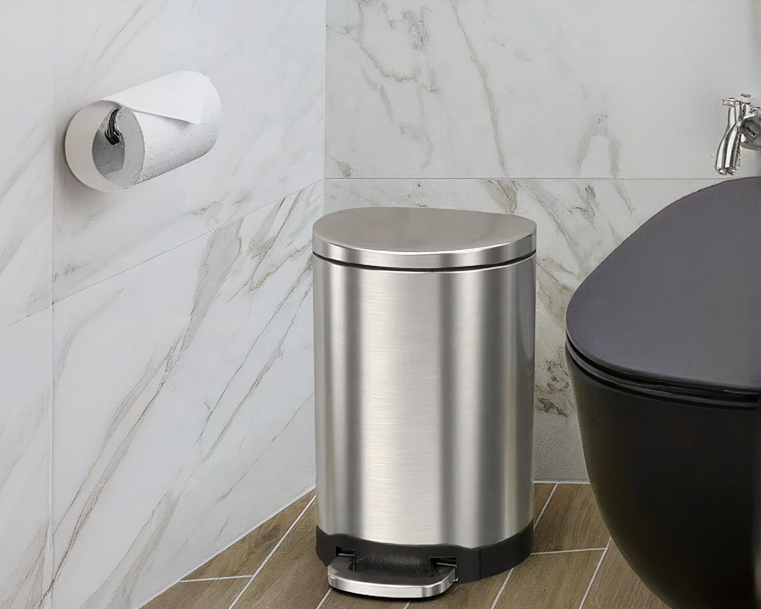 Notre poubelle de salle de bain est un modèle sophistiqué à pédale au look moderne et au design semi-rond original. La pédale permet une utilisation facile et hygiénique mains libres avec un couvercle qui s'ouvre à 90 degrés et peut rester ouvert : sa fermeture est douce et silencieuse. Le seau amovible en plastique est lavable et donc facile à entretenir.