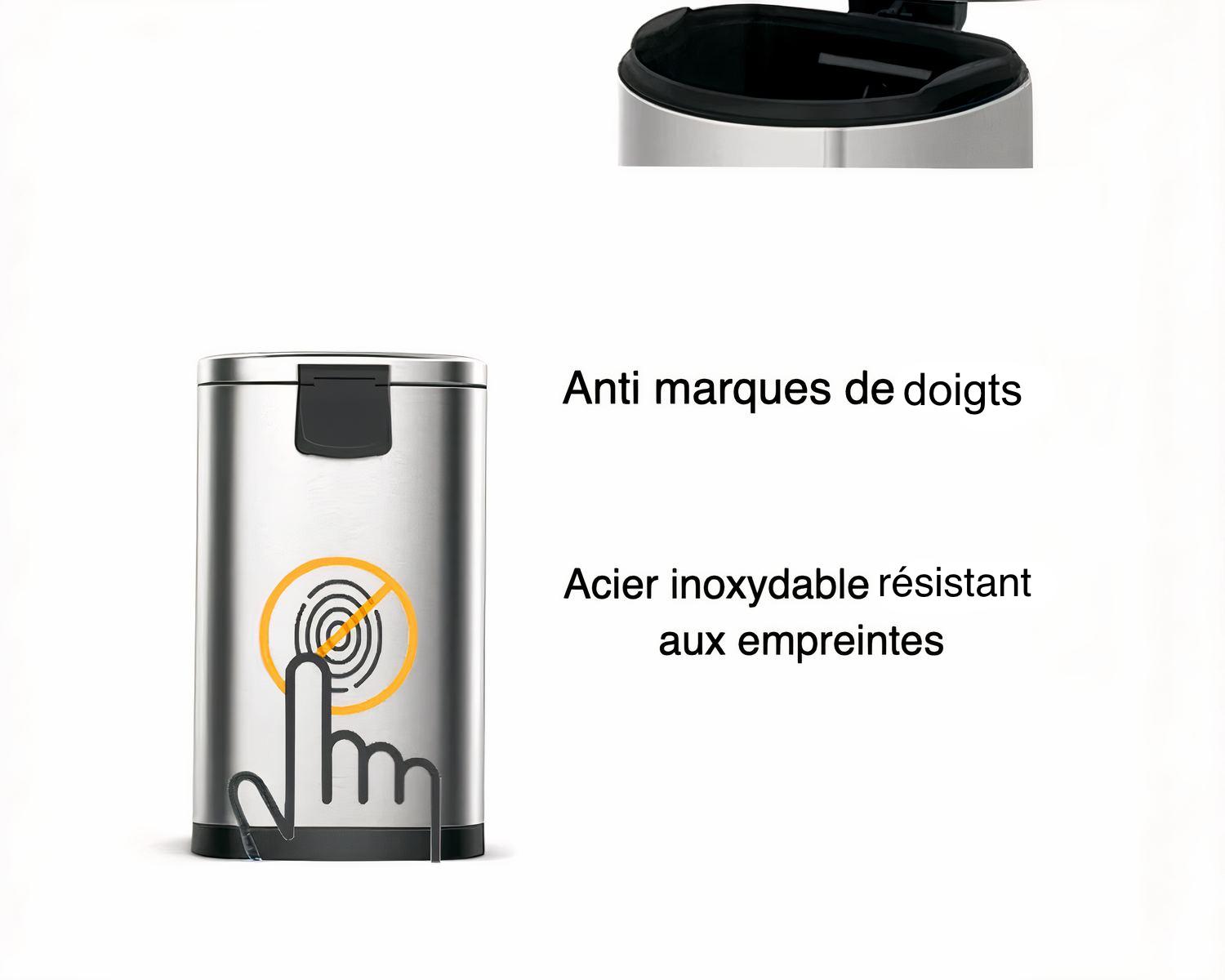 L'acier inoxydable qui compose le corps extérieur de notre poubelle est anti-usure et anti-corrosion. Durable et de haute qualité, son fini satiné est à l'épreuve des marques de doigts. Une poignée extérieure se trouve au dos pour plus de maniabilité. Son look tendance et moderne, à la couleur intemporelle, lui permet de s'intégrer dans les espaces de tous styles de décoration.