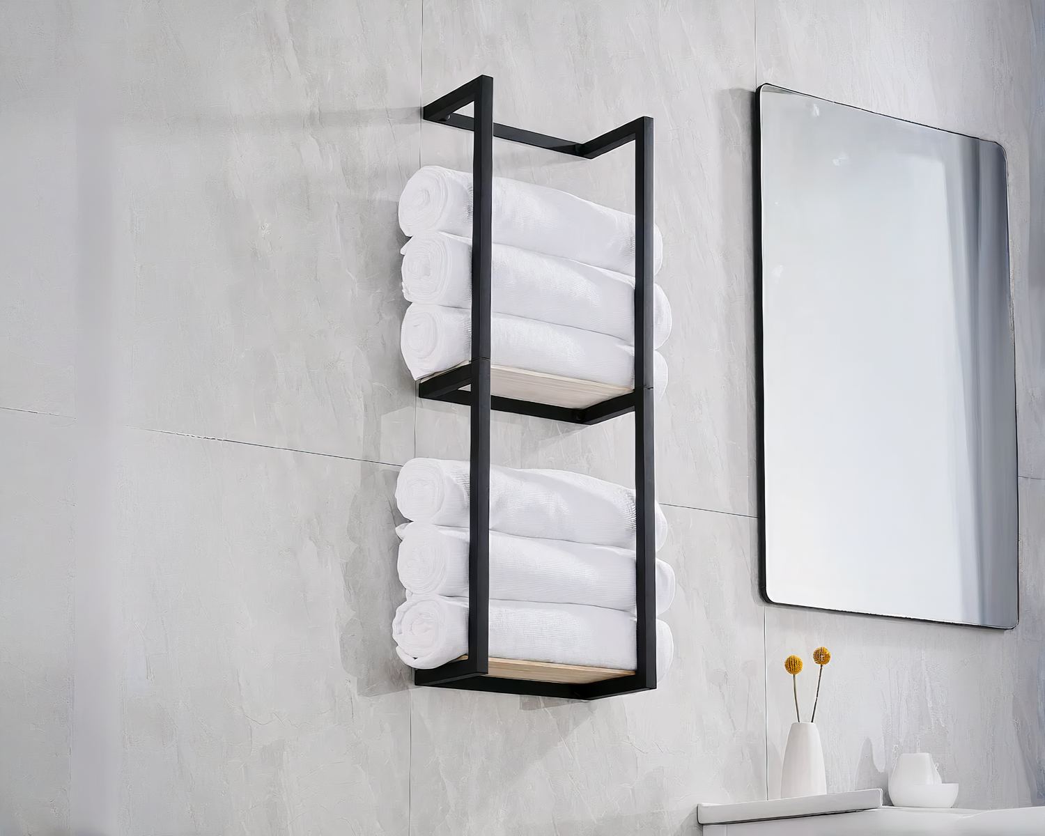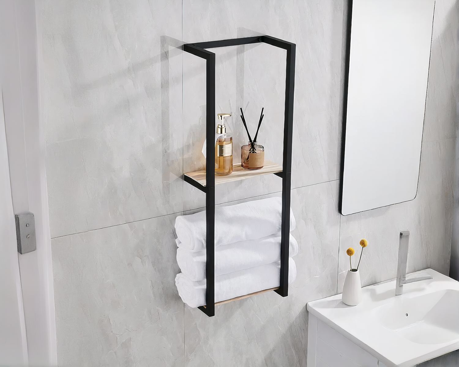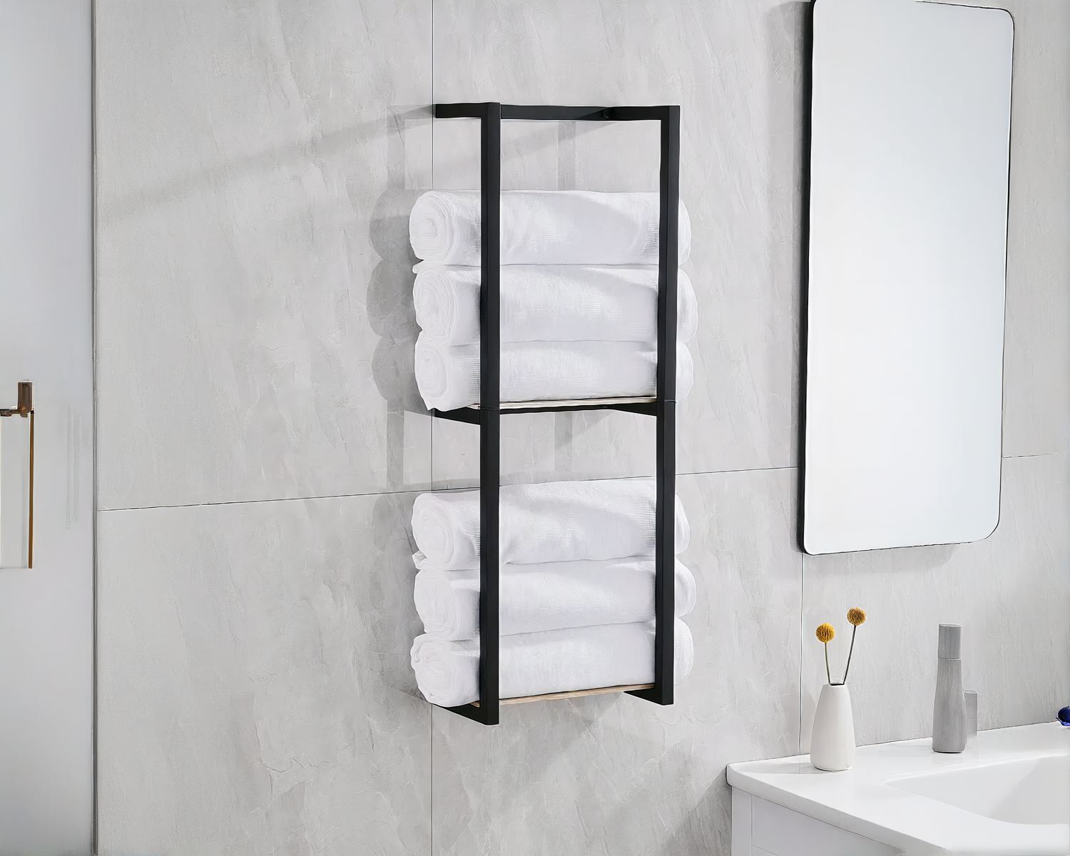 Ce rangement pour serviettes de salle de bain mural est un accessoire pratique et élégant qui vous permettra d'optimiser l'espace dans votre salle de bain. Doté de tablette, ce rangement vous offre un espace de stockage supplémentaire et polyvalent, pour vos serviettes, produits de beauté ou autres accessoires de salle de bain.
